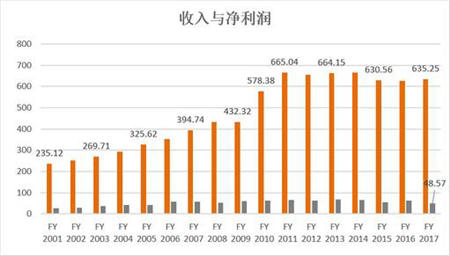 公司2017年的收入為635.25億美元,比2016年的627.99億上升了1.15%。公司的收入雖然巨大但是公司的利潤(rùn)率卻并不高。2017年公司的凈利潤(rùn)為48.57億元,銷售利潤(rùn)率為7.64%。2017年公司的每股收益為3.4美元。
