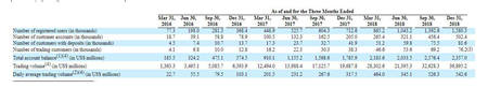 從季度的運(yùn)營數(shù)據(jù)來看,2016-2018年間,老虎證券影響力逐步擴(kuò)大。注冊用戶量實(shí)現(xiàn)從2016年第一季度的7.73萬到2018年末的158萬;成交量則從13.6億美元擴(kuò)大到369.0億美元。