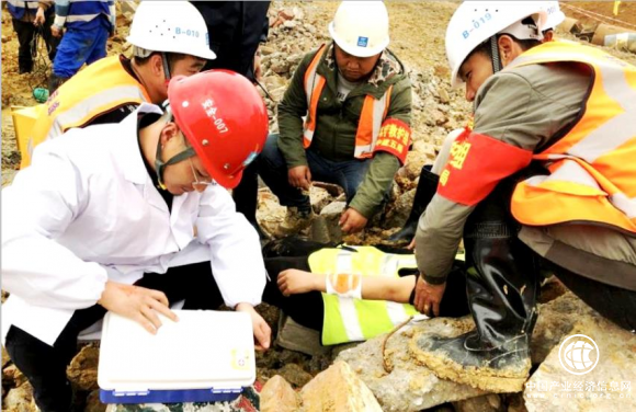 大約過(guò)了10分鐘,搶險(xiǎn)隊(duì)發(fā)現(xiàn)現(xiàn)場(chǎng)有一人左腿被落石“砸傷”,導(dǎo)致左腿“骨折”。醫(yī)療救護(hù)組立即向指揮長(zhǎng)報(bào)告:“報(bào)告指揮長(zhǎng),在撤離過(guò)程中發(fā)現(xiàn)有一人左腿被落石砸傷,造成左腿骨折,被搶險(xiǎn)救援人員抬至安全區(qū),病情十分危急,請(qǐng)求支援。”