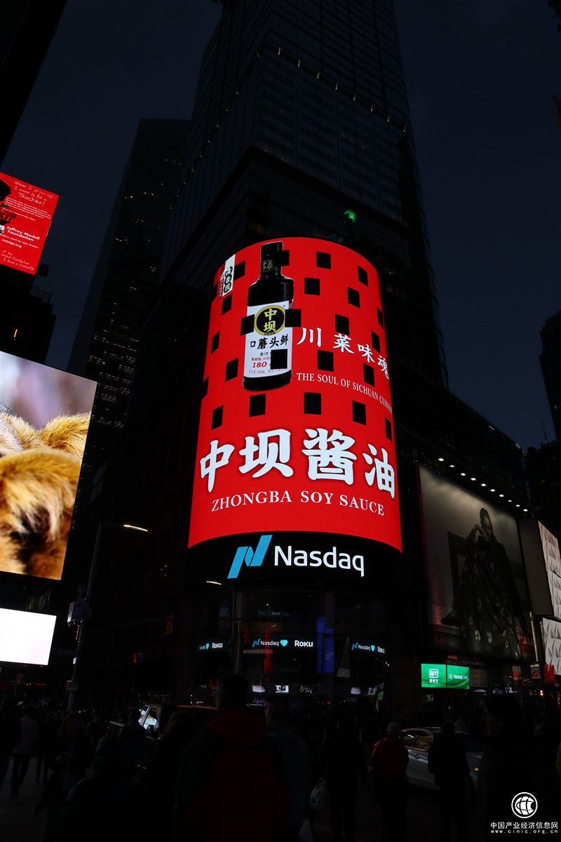 “中國(guó)調(diào)味品的驕傲!”、“沸騰吧,中國(guó)紅!”4月初開始,川調(diào)界一片熱鬧。朋友圈不斷有業(yè)內(nèi)人士曬出中壩醬油霸屏納斯達(dá)克巨幅廣告的照片,這是今年來(lái),川調(diào)界的第一件大事,首次“登陸”美國(guó)紐約時(shí)代廣場(chǎng)。時(shí)代廣場(chǎng)以繁華出名,有著“世界十字路口”的美稱,廣場(chǎng)上的納斯達(dá)克廣告屏被喻為“世界第一屏”,作為年均客流量數(shù)千萬(wàn)人次、人流量上億人次的商業(yè)聚集地,阿里巴巴、騰訊等眾多知名企業(yè)都曾在時(shí)代廣場(chǎng)的納斯達(dá)克大屏上留下足跡,是世界上各大一流品牌公司向世界發(fā)聲的秀場(chǎng),是企業(yè)品牌的標(biāo)桿。