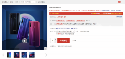 今日(4月10日),有網(wǎng)友發(fā)現(xiàn),榮耀20i已經(jīng)在VMALL商城、京東和天貓開啟了預(yù)約頁(yè)面。值得注意的是,不知道是榮耀工作人員操作失誤,還是有意為之,在這些已經(jīng)意外放出的預(yù)約頁(yè)面上,我們可以看到榮耀20i的不同顏色的外觀都已經(jīng)提前揭曉,一些重要的配置也被泄露。