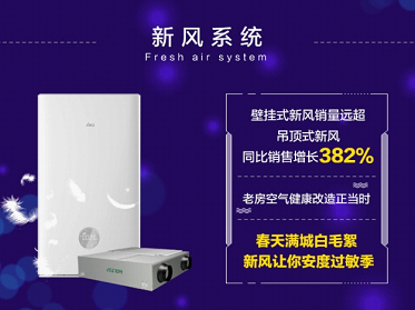 4月正值南方城市飄絮,過(guò)敏人群叫苦不迭。適合已裝修房的壁掛式新風(fēng)機(jī)迎來(lái)熱銷,同比銷售增長(zhǎng)382%,遠(yuǎn)超吊頂式新風(fēng)。