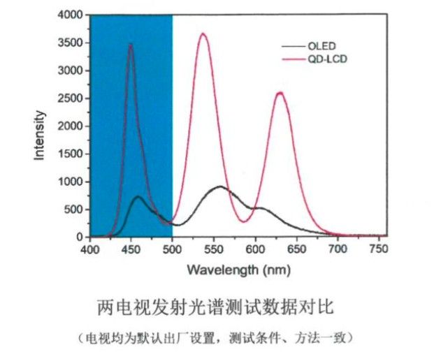 測試結(jié)果顯示,在400-500nm藍光范圍內(nèi),OLED電視藍光放射量為29923(400、500nm曲線下積分值,相對值,無單位),QD-LCD電視藍光放射量為87140(400、500nm曲線下積分值,相對值,無單位),說明OLED電視發(fā)生藍光損傷的風(fēng)險小于量子點液晶電視