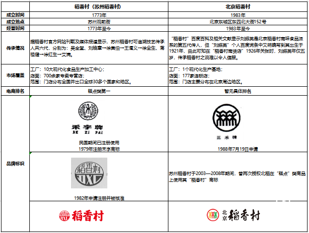 ▲蘇州稻香村與北京稻香村品牌概況對(duì)比圖
