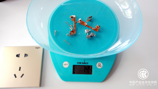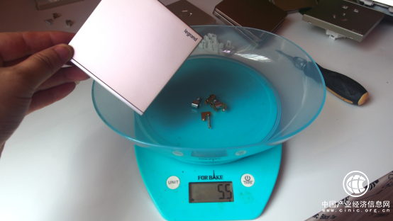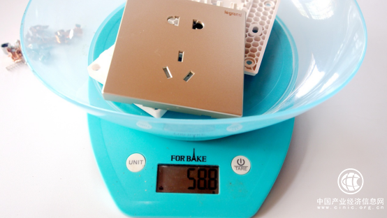 用料方面,去掉所有金屬件之后,只稱(chēng)取塑膠件的重量,包括保護(hù)門(mén),羅格朗逸景插座測(cè)試結(jié)果為58.8g 。