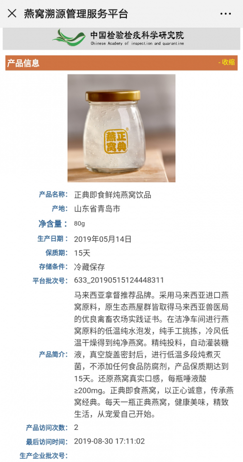 溯源即食燕窩通過(guò)中國(guó)檢科院CAIQ溯源認(rèn)證,均來(lái)自注冊(cè)認(rèn)證企業(yè)、通過(guò)合法檢疫進(jìn)口、CAIQ溯源,原料來(lái)源、生產(chǎn)企業(yè)、檢驗(yàn)檢疫證書(shū)等均可查詢(xún)。從而確保每一份燕窩均為真材實(shí)料,以保障消費(fèi)者利益不受損害。