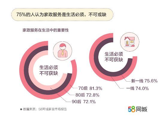據(jù)58同城《中國家政市場就業(yè)及消費報告》統(tǒng)計,75.1%的人認為家政服務不可或缺,其中,81.3%的70后認為家政服務在生活中必不可少,占比高于80后和90后。由于70后處于職業(yè)發(fā)展的“黃金期”,又面臨“上有老、下有小”的“中年困境”,很難有時間兼顧事業(yè)與家務,對家政服務的依賴性更強。