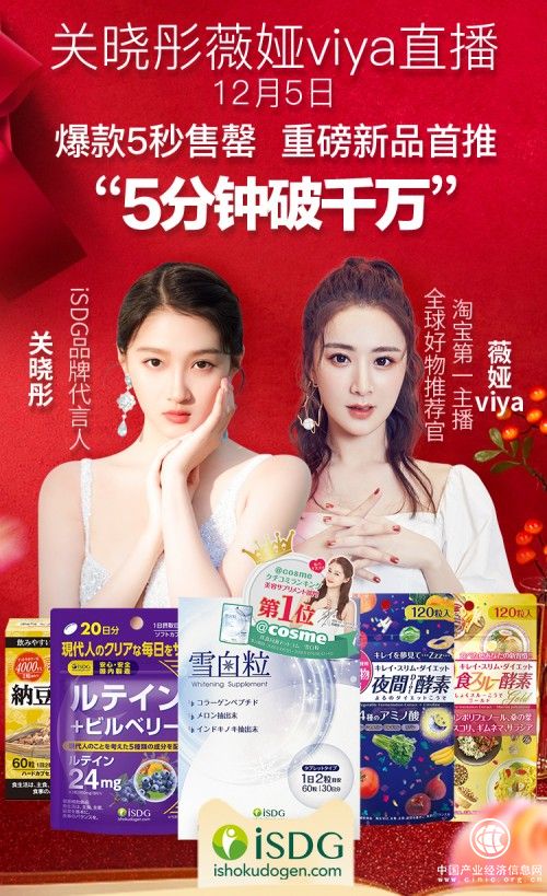 日本知名營(yíng)養(yǎng)品牌iSDG繼雙十一之后,銷(xiāo)售額再創(chuàng)新高!12月5日,iSDG品牌代言人關(guān)曉彤做客薇婭viya直播間,一起暢聊自然美麗小心機(jī),和iSDG產(chǎn)品帶來(lái)的美好改變。直播5分鐘銷(xiāo)售額破千萬(wàn),其中,新品雪白粒、葉黃素、納豆生活5分鐘售罄!