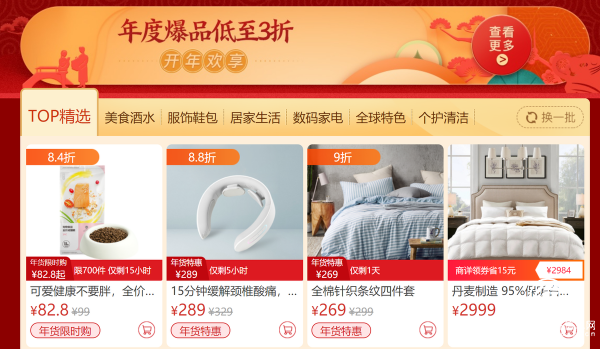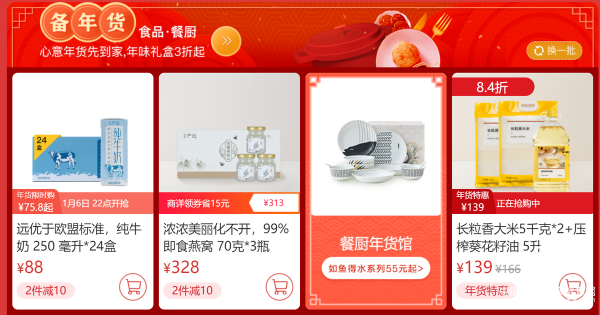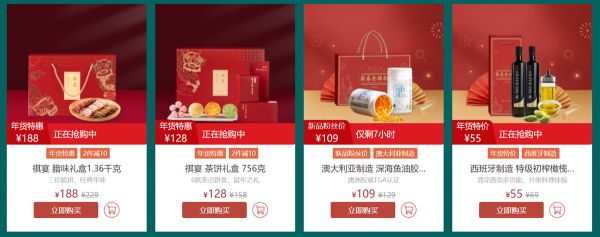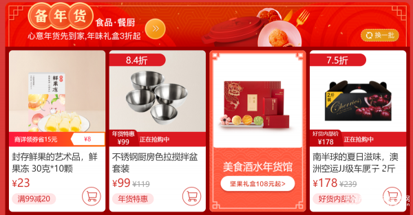 1月4日-1月6日三天,“嚴(yán)選年貨節(jié)”開啟了食品餐廚專場,眾多心意年貨參加了全場特價三折起,包括“年貨特惠”、“新品粉絲價”、“好貨內(nèi)部價”等在內(nèi)的多種年度終極促銷活動。其中,“南半球夏日滋味——澳洲空運(yùn)車?yán)遄?rdquo;、“冰清玉潤——馬來進(jìn)口燕盞”、“名莊金獎加身——西班牙珍藏干紅葡萄酒”等眾多好物成為美食美酒年貨館最受熱捧年貨。