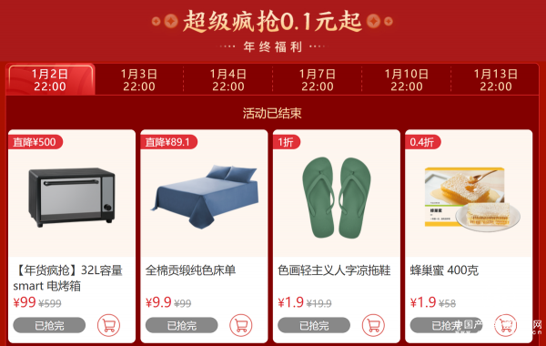 另外,網(wǎng)易嚴(yán)選還打造了包括“超級瘋搶0.1元起”、“三石壓歲錢1億回饋金”“1元拼團(tuán)”、“0.1元拼團(tuán)”等多重趣味年貨搶購?fù)娣ā?/p>