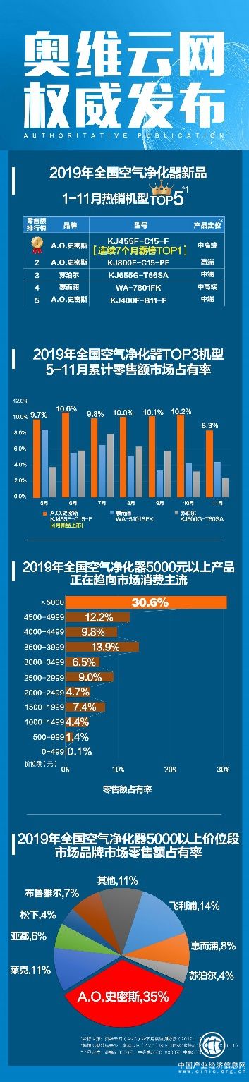 從美通社獲知,2019年全國空氣凈化器市場表現(xiàn)數(shù)據(jù)中, A.O.史密斯甲醛凈化器新品KJ455F-C15-F連續(xù)7個月霸榜TOP1??v觀2019年整個空氣凈化器市場,5000元以上價位段產(chǎn)品正在趨向市場消費主流;而在5000元以上空氣凈化器產(chǎn)品中,A.O.史密斯甲醛凈化器已經(jīng)成為用戶的主要選擇。(數(shù)據(jù)來源:奧維云網(wǎng))