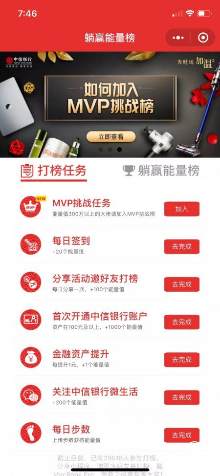 【躺贏能量榜】是中信銀行為客戶定制的有獎打榜活動,玩法非常簡單。依托微信小程序,用戶注冊小程序后,可以做任務、攢能量,靠能量值排名贏大獎。躺贏能量榜設有全國個人能量排行榜、分行個人能量排行榜、MVP挑戰(zhàn)榜三大榜單。每月排名靠前的客戶,可以獲得蘋果筆記本電腦、戴森吸塵器、海藍之謎面霜等眾多有吸引力的大獎。