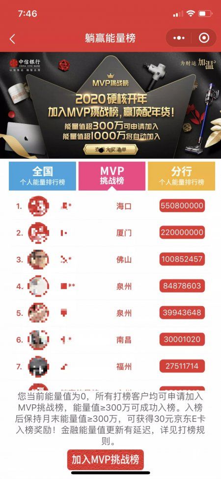 第三,大中產(chǎn)們會主動與銀行交互、共創(chuàng)服務?!咎哨A能量榜】在2019年新增了MVP挑戰(zhàn)榜,針對能量值300萬以上的玩家準入。這個設定源于收到很多打榜客戶的提議:如何讓一個游戲更好玩?增加一個臨界值,讓不同的玩家進入和自己一樣水準的競爭圈子,這才是游戲的魅力。