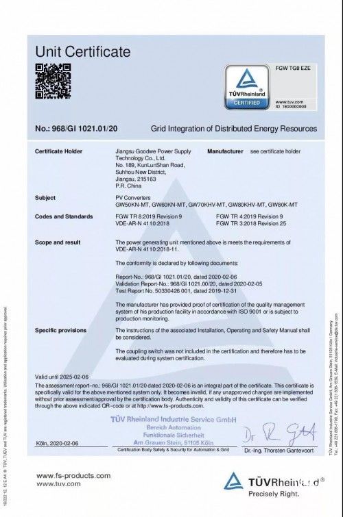 近日,德國萊茵TüV集團(以下簡稱“TüV萊茵”)向江蘇固德威電源科技股份有限公司(以下簡稱“固德威”)MT系列智能光伏逆變器頒發(fā)TüV萊茵首張中壓并網(wǎng)VDE-AR-N 4110證書。
