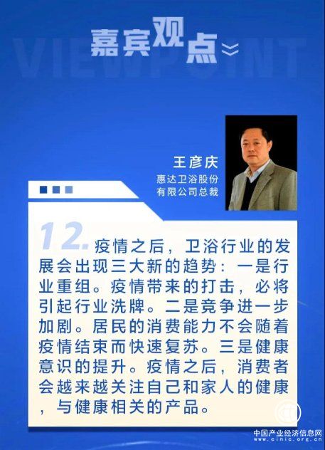 2月27日,在人民網(wǎng)主辦的“金臺圓桌”人民戰(zhàn)疫·房地產(chǎn)家居企業(yè)對策共商會上,惠達(dá)衛(wèi)浴總裁王彥慶表示,這次疫情是衛(wèi)浴企業(yè)開始向線上轉(zhuǎn)移,實(shí)現(xiàn)線上線下一體化的重要契機(jī)。要把握疫情后三大行業(yè)趨勢,抓住危機(jī)給予的發(fā)展機(jī)會。
