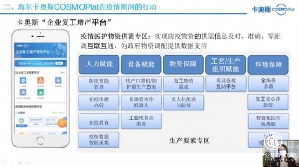 首期培訓(xùn)課程中,兩位嘉賓都重點(diǎn)介紹了工業(yè)互聯(lián)網(wǎng)在新冠肺炎疫情防控和企業(yè)復(fù)工復(fù)產(chǎn)過程中發(fā)揮的重要作用。嚴(yán)鵬飛從自身在本次疫情期間的實(shí)際行動(dòng)出發(fā),分享了平臺(tái)基于企業(yè)疫情防控管理和復(fù)工復(fù)產(chǎn)需求,如何全流程賦能企業(yè)實(shí)現(xiàn)復(fù)工增產(chǎn),以及卡奧斯COSMOPlat“復(fù)工增產(chǎn)服務(wù)平臺(tái)”的應(yīng)用案例。