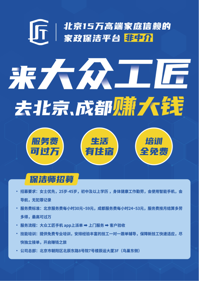 目前,中國(guó)家政服務(wù)業(yè)備受政策關(guān)注,家政服務(wù)體制機(jī)制逐漸完善,專業(yè)家政人才需求量不斷增加!大眾工匠作為一站式家庭生活服務(wù)平臺(tái),積極響應(yīng)國(guó)家“互聯(lián)網(wǎng)+家政”的相關(guān)政策,將匠心精神貫徹到底,通過(guò)每一位服務(wù)者專注、專業(yè)的服務(wù),為用戶帶來(lái)精致又擁有幸福感的生活體驗(yàn),做好家庭的大后勤。