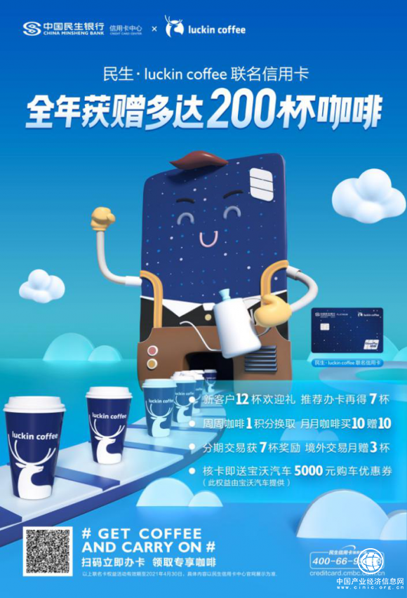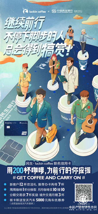 在助力復(fù)產(chǎn)復(fù)工,服務(wù)大眾的關(guān)鍵時刻,民生信用卡積極響應(yīng)號召,應(yīng)需行動,與瑞幸咖啡共同攜手,推出“民生·luckin coffee聯(lián)名信用卡”,打造復(fù)產(chǎn)復(fù)工“醒腦加油站”,不僅想為共抗疫情的廣大奮斗的工作者們加油,更是為所有人的生活滿足感和幸福感添注一份暖暖的香甜力量。