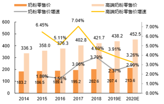 所以我們看到,國(guó)內(nèi)奶粉單價(jià)由2014年183.2元/kg提升至2019年的207元/kg。