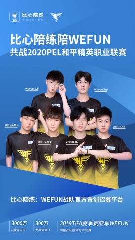 比心陪練簽約了英雄聯(lián)盟S8冠軍iG、S9冠軍FPX,王者榮耀2019KPL春季賽、世冠杯冠軍eStarPro和秋季賽冠軍AG超玩會等頂級戰(zhàn)隊。WEFUN此次成為繼2019PEL冠軍4AM、2019“四冠王”Tianba、2020猛男杯冠軍AG后,第四支獲得比心陪練贊助簽約的和平精英戰(zhàn)隊。獲得比心陪練簽約合作,標志著WEFUN受到業(yè)內(nèi)主流贊助商的認可,對于WEFUN的戰(zhàn)隊品牌建設(shè)有著重要的意義。