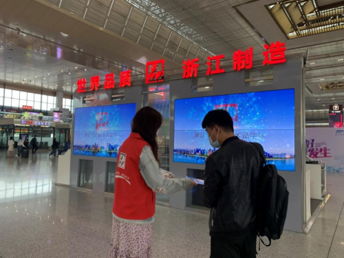 近日來,杭州東站、上海虹橋站以及南京南站三大高鐵站的“品字標(biāo)”展廳人潮涌動,鮮紅色的“品字標(biāo)”LOGO以及“世界品質(zhì) 浙江制造”口號醒目地矗立在展廳上方,伴隨著“品字標(biāo)”公益廣告悠揚的音樂,一群身穿“品字標(biāo)”紅色馬甲的志愿者正穿梭在的候車廳,為來往的行人宣傳“品字標(biāo)”,講解“品字碼”,推廣浙江好產(chǎn)品!