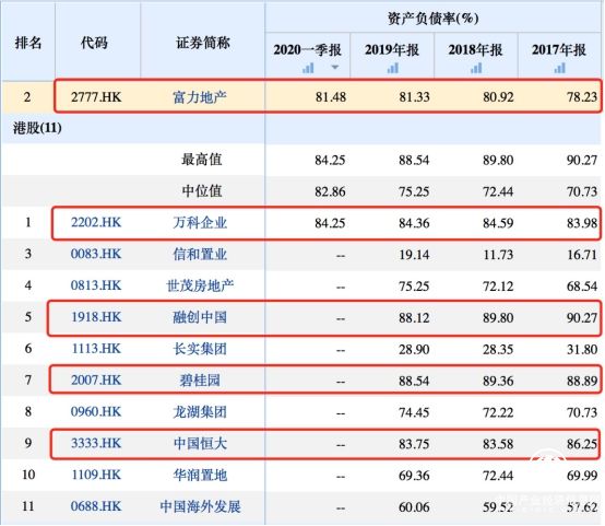 橫向?qū)Ρ确康禺a(chǎn)行業(yè)的資產(chǎn)負(fù)債率,富力的負(fù)債率并不算高,大概處于平均水平。2019年富力資產(chǎn)負(fù)債率為81.33%,在港股上市的11家房企中,碧桂園、融創(chuàng)、恒大、萬科的負(fù)債率都高于富力。