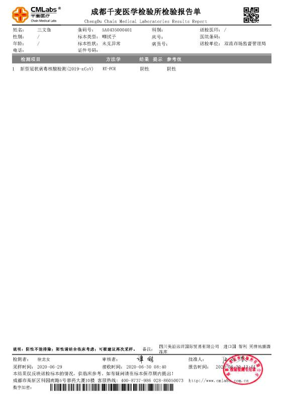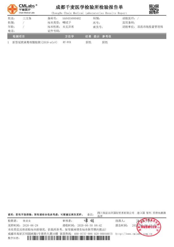 為讓消費者放心食用,6月29日,佳沃股份將從智利進口、條碼為5A0435000401、5A0435000402的三文魚送至雙流市場監(jiān)督管理局,進行咽拭子檢測,其新型冠狀病毒核酸檢測(2019-nCoV)結(jié)果為陰性,當?shù)叵M者可以放心選購。