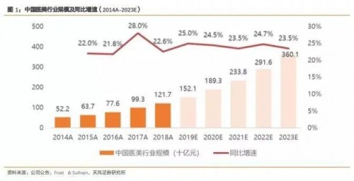 據(jù)Frost & Sullivan的研究報告,2014-2018年中國醫(yī)美行業(yè)規(guī)模復合增速為23.6%,預計2023年醫(yī)美行業(yè)規(guī)模有望達到3601億元。