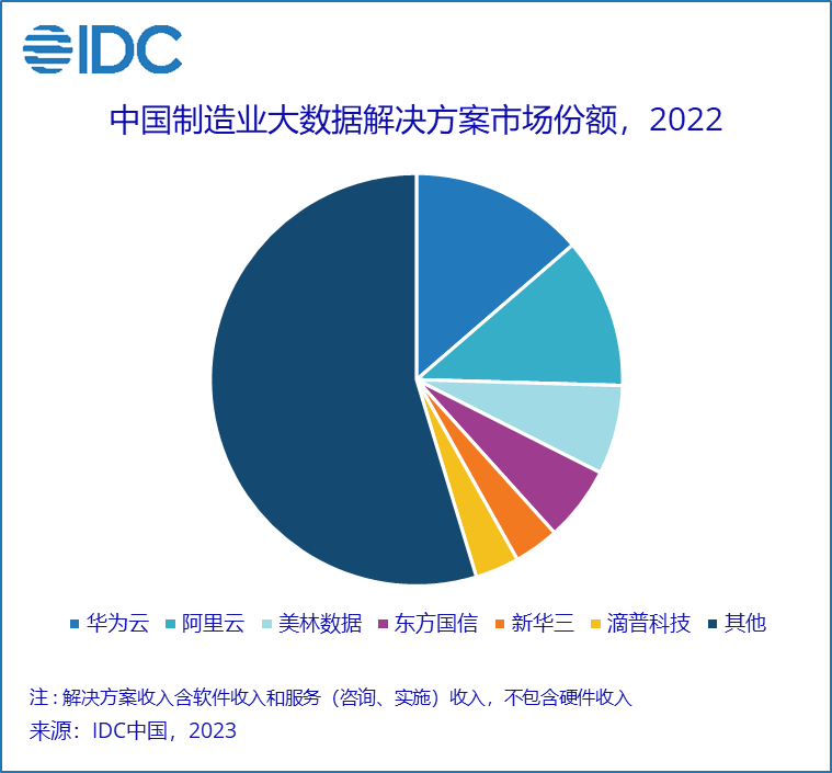 IDC數(shù)據(jù)顯示,2022年中國(guó)制造行業(yè)大數(shù)據(jù)解決方案總市場(chǎng)份額達(dá)到21.3億元人民幣,華為云位居第一,阿里云緊隨其后,美林?jǐn)?shù)據(jù)、東方國(guó)信、新華三、滴普科技分列第三到第六。