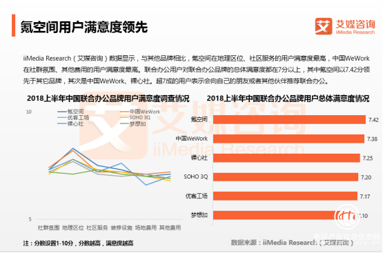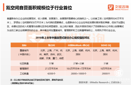 在當(dāng)前以氪空間、中國WeWork為代表的堅持自營模式的聯(lián)合辦公企業(yè)中,氪空間在覆蓋城市、管理面積和工位數(shù)量等指標(biāo)上,均領(lǐng)先于同行業(yè)企業(yè)。截止到2018年6月底,氪空間自營管理面積達(dá)27.3萬平方米,運營57家聯(lián)合辦公社區(qū),工位數(shù)量達(dá)42000個,服務(wù)企業(yè)數(shù)量超過3000家,會員數(shù)量超過30000人。中國WeWork收購裸心社后,自營覆蓋面積達(dá)25.6萬平方米,運營社區(qū)達(dá)49家,提供工位數(shù)量達(dá)38000個。相比之下,氪空間自營管理面積超過中國WeWork,處于行業(yè)領(lǐng)先地位。iiMedia Research(艾媒咨詢)數(shù)據(jù)顯示,聯(lián)合辦公用戶對聯(lián)合辦公品牌的總體滿意度都在7分以上,其中氪空間以7.42分排名第一,其次是中國WeWork、裸心社。氪空間成立于2014年,最初是36氪旗下的孵化器。2016年1月,氪空間從36氪拆分出來正式轉(zhuǎn)型聯(lián)合辦公,兩年多時間進(jìn)行了多輪融資,并且堅持自營模式,精耕用戶服務(wù),在供應(yīng)鏈整合、空間設(shè)計、線下社群運營、智能化管理形成自身核心競爭力,但盈利模式單一,盈利結(jié)構(gòu)有待完善。WeWork 在2016年7月首次進(jìn)入中國市場,于2017年7月設(shè)立中國分部,2018年4月, WeWork以25億人民幣收購裸心社。WeWork采用會員制的模式,形成以服務(wù)+社區(qū)特色,構(gòu)建用戶線上線下交流平臺。但中國本土企業(yè)實力快速提升,同業(yè)競爭日益激烈,中美不同的市場環(huán)境、辦公文化等因素將對WeWork在中國的擴(kuò)張構(gòu)成威脅。