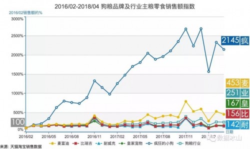 在寵物食品市場,國內(nèi)品牌同樣是從互聯(lián)網(wǎng)渠道起步,吹響了反攻洋品牌的號角。其中,有“寵物行業(yè)的小米”之稱的瘋狂小狗,更是在洋品牌占據(jù)國產(chǎn)狗糧大半壁江山的行業(yè)現(xiàn)狀下,憑借高質(zhì)量、高性價比的狗糧產(chǎn)品打破外國品牌的暴利壟斷,僅用三年時間就成為全網(wǎng)銷量第一的國產(chǎn)品牌。數(shù)據(jù)顯示,2017年,瘋狂小狗銷售額超過3.2億元,年均增長速度達300%,2018預(yù)計將達到5.2億元。