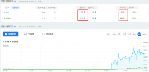 這一論斷并非憑空臆測。首先,從能夠初步衡量行業(yè)影響力和關(guān)注的百度指數(shù)看,“新零售”和“智慧零售”目前已納入百度指數(shù)。作為最具廣泛影響力的零售概念,“新零售”指數(shù)遠(yuǎn)遠(yuǎn)高于“智慧零售”。但在增幅上,“智慧零售”則保持著近100%的指數(shù)增幅。而“無界零售”其影響力較弱,并未被收錄至百度指數(shù)。從搜索結(jié)果上看,新零售高于智慧零售,而無界零售同樣最低。