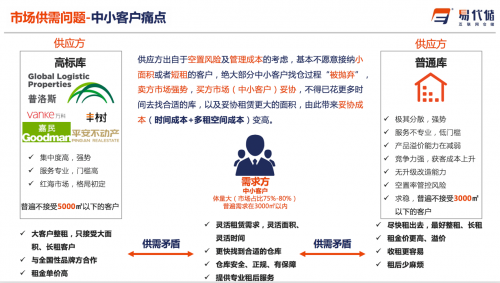 在易代儲看來,倉儲租賃市場主要由中小客戶驅(qū)動,但80%的普通倉為求穩(wěn)而不愿接收零散中小客戶;同時大多數(shù)中小客戶出于成本考慮更趨向于靈活時間、靈活面積租賃。