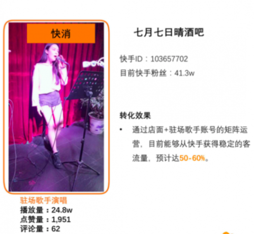 商家在進(jìn)行短視頻營銷時(shí)應(yīng)充分考慮場景這一核心要素, 以達(dá)到更好的傳播效果。在快手平臺(tái)獲得的關(guān)注度能夠高效地在相應(yīng)實(shí)體店面變現(xiàn)。同時(shí)快手平臺(tái)人工智能技術(shù)實(shí)現(xiàn)精準(zhǔn)匹配推送至需要的人群,形成了資源的高效匹配。例如酒吧駐唱歌手通過在快手平臺(tái)發(fā)布演唱視頻的方式積累的人氣能夠轉(zhuǎn)化為真實(shí)客流。