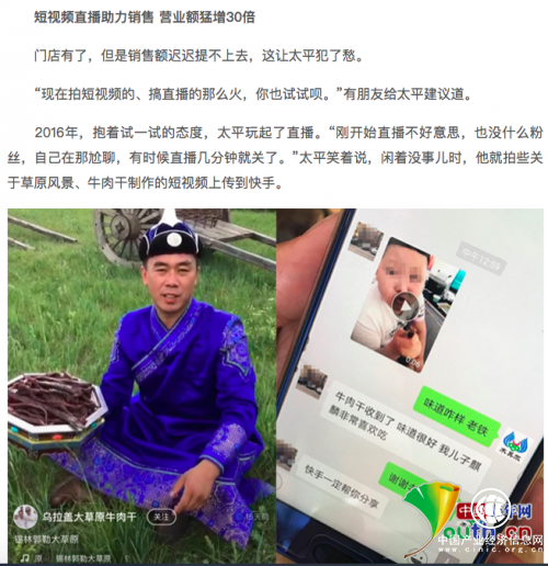 錫林郭勒盟烏拉蓋草原的蒙古族漢子太平,通過在快手記錄自家制作牛肉干的過程,吸引了眾多快手老鐵的關(guān)注,逐步打開了市場,擴(kuò)大了生產(chǎn)規(guī)模,并帶動(dòng)當(dāng)?shù)刎毨裘撠氈赂弧?/p>
