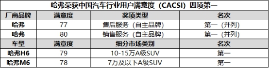 其中,哈弗品牌獲售后服務(wù)滿意度、銷售服務(wù)滿意度兩項第一;哈弗H6獲10-15萬A級SUV用戶滿意度第一,累計4年獲此殊榮;哈弗M6獲7萬級以下A級SUV用戶滿意度第一名。
