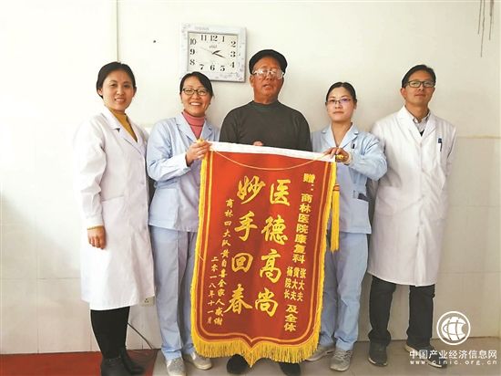 圖為偏癱患者經(jīng)過兩個月的康復治療,可以生活自理,給商林康復團隊送來錦旗。