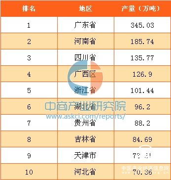 2017年6月,飲料產(chǎn)量排名前十的地區(qū)分別是廣東省、河南省、四川省、廣西區(qū)、浙江省、湖北省、貴州省、吉林省、天津市、河北省。其中,前五名地區(qū)產(chǎn)量均超百萬噸,廣東省以月產(chǎn)量345.03萬噸居排行榜首位,為全國飲料生產(chǎn)大省。