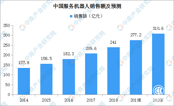 我國服務(wù)機(jī)器人產(chǎn)業(yè)起步相對(duì)較晚,部分產(chǎn)品還處于研發(fā)試驗(yàn)階段。但隨著技術(shù)不斷提升、居民消費(fèi)水平提高,價(jià)格多層次符合多個(gè)消費(fèi)群體需求,服務(wù)機(jī)器人的應(yīng)用范圍越來越廣,如掃地機(jī)器人、導(dǎo)航機(jī)器人、陪伴機(jī)器人等服務(wù)機(jī)器人走入“尋常百姓家”,消費(fèi)市場(chǎng)不斷擴(kuò)大。數(shù)據(jù)顯示,2017年我國服務(wù)機(jī)器人銷售額超200億元。市場(chǎng)規(guī)模不斷增長,2018年服務(wù)機(jī)器人市場(chǎng)銷售額在241億元左右,預(yù)計(jì)2019年將超270億元,到2020年將超300億元。