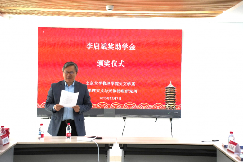儀式由北京大學(xué)物理學(xué)院天文學(xué)系主任張華偉教授主持,天文學(xué)系吳學(xué)兵教授首先介紹獎(jiǎng)助學(xué)金設(shè)立背景:為紀(jì)念著名天文學(xué)家、原中國(guó)科學(xué)院北京天文臺(tái)(現(xiàn)國(guó)家天文臺(tái))臺(tái)長(zhǎng)李啟斌先生,培育天文領(lǐng)域后備人才,該獎(jiǎng)助學(xué)金面向北大天文學(xué)科優(yōu)秀本研學(xué)生設(shè)立。2025年11月經(jīng)學(xué)生申請(qǐng)、系評(píng)審委員會(huì)五位老師投票,最終八位同學(xué)入選。吳學(xué)兵教授鼓勵(lì)同學(xué)們傳承老一輩天文學(xué)家的奉獻(xiàn)精神,扎實(shí)治學(xué),為我國(guó)天文事業(yè)添磚加瓦。