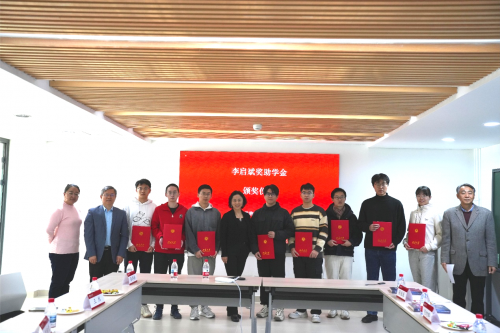 接下來,張華偉教授公布了獲獎(jiǎng)的四名本科生和四名研究生同學(xué)名單,八名獲獎(jiǎng)學(xué)生上臺(tái)領(lǐng)獎(jiǎng)。李啟斌基金會(huì)理事長(zhǎng)李亦非女士和吳學(xué)兵教授共同為獲獎(jiǎng)同學(xué)頒發(fā)證書,參會(huì)嘉賓與獲獎(jiǎng)同學(xué)合影留念。