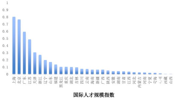 “境外來華工作專家規(guī)模指數(shù)”反映了來中國境外專家的區(qū)域分布情況。研究顯示,廣東是引進外國專家最多的省份(0.82),上海(0.77)、江蘇(0.64)、北京(0.63)分列2-4位。“這與‘來華留學生規(guī)模指數(shù)’中各區(qū)域差異情況相似,說明當前我國國際人才分布的均衡程度相對較差。”王輝耀說。