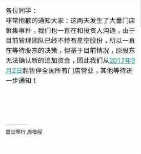 然而9月20日,星空琴行發(fā)布通告稱,CEO周楷程突然失蹤,至今無法聯(lián)系上。并表示,由于過往的盲目擴張導致資金鏈出現(xiàn)問題,進而導致了“突發(fā)暫停營業(yè)事件。”星空琴行一名中層領導透露,目前投資人已經(jīng)放棄星空琴行,星空琴行全國的員工包括所有老師都已提出離職申請。