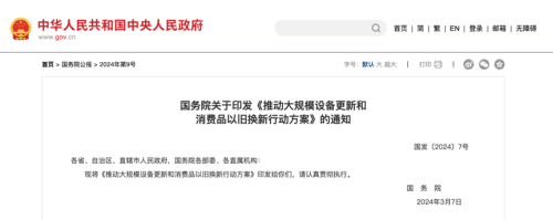 3月7日,《推動(dòng)大規(guī)模設(shè)備更新和消費(fèi)品以舊換新行動(dòng)方案》正式發(fā)布。