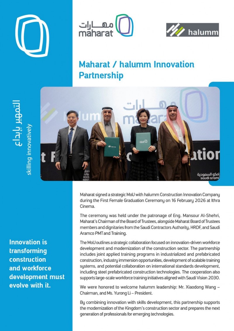 在沙特達(dá)曼阿卜杜勒阿齊茲國(guó)王世界文化中心(Ithra)首屆女畢業(yè)生畢業(yè)典禮上,漢爾姆與沙特知名建筑職業(yè)教育機(jī)構(gòu)Maharat簽署了戰(zhàn)略合作協(xié)議。這不僅是一項(xiàng)產(chǎn)業(yè)職教合作,更是漢爾姆引領(lǐng)沙特建筑業(yè)發(fā)展,以教育賦能本土工人提高技能、踐行公益初心的重要實(shí)踐。