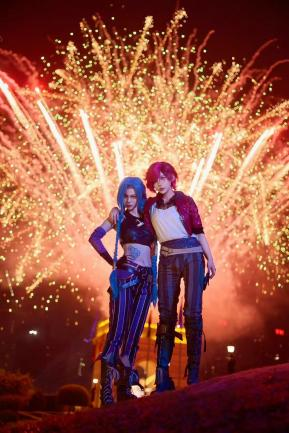 (圖為雙城之戰(zhàn)人氣角色“金克絲”和“蔚”Cosplay表演)