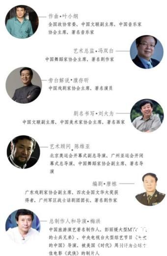 《禪宗圣域·六祖惠能》大型實景音畫大典匯聚國家級創(chuàng)作團隊,由全國政協(xié)常委、中國文聯(lián)副主席、中國音樂家協(xié)會、著名音樂家葉小綱擔(dān)任作曲、中國舞蹈家協(xié)會主席馮雙白擔(dān)任藝術(shù)總監(jiān)、中國戲劇家協(xié)會主席濮存昕擔(dān)任旁白解說、中國美術(shù)家協(xié)會主席劉大為書寫劇名,中國舞蹈家協(xié)會副主席陳維亞擔(dān)任藝術(shù)顧問、廣東戲劇家協(xié)會副主席唐棟擔(dān)任編劇、中國旅游演藝著名制作人梅洪擔(dān)任總制作人和導(dǎo)演。