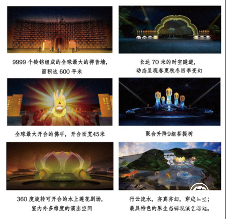 趙總監(jiān)表示,《禪宗圣域·六祖惠能》在傳統(tǒng)實景演出的基礎(chǔ)上,加入創(chuàng)新元素,可謂是“全面升級”,通過各種聲、光、電等高新設(shè)備,融入目前最新的全息投影技術(shù),打造出前所未有、虛實結(jié)合、亦真亦幻的震撼效果,創(chuàng)造出多個全球獨一無二:360度旋轉(zhuǎn)可開合的蓮花劇場、9999個鈴鐺組成全球最大的禪音墻、長達70米的以動態(tài)呈現(xiàn)四季變幻的時空隧道、全球最大的開合佛手以及9組聚合升降的菩提樹等,結(jié)合自然生態(tài)場景,為觀眾呈現(xiàn)出一場前所未有的視覺盛宴。