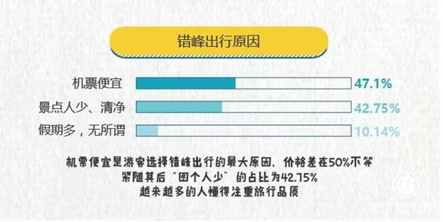 47.1%的人因機(jī)票價(jià)格更為合理而選擇錯(cuò)峰出行,42.7%的人更在意錯(cuò)峰出行景點(diǎn)人少,注重旅行的舒適度~