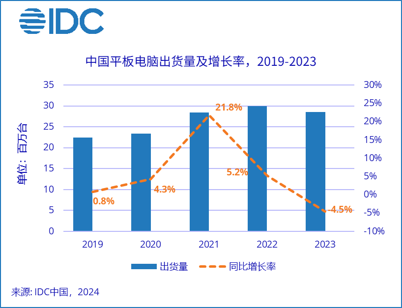 近日,國際數(shù)據(jù)公司(IDC)發(fā)布了 2023 年第四季度中國平板電腦季度跟蹤報(bào)告,數(shù)據(jù)顯示,2023 年第四季度中國平板電腦市場出貨量約 817 萬臺,同比下降約 5.7%,其中消費(fèi)市場同比下降 7.3%,商用市場同比增長 13.8%。